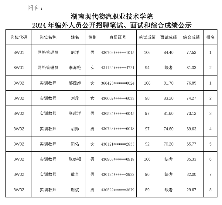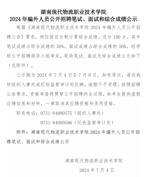 湖南现代物流职业技术学院2024年编外人员公开招聘笔试、面试和综合成绩公示
